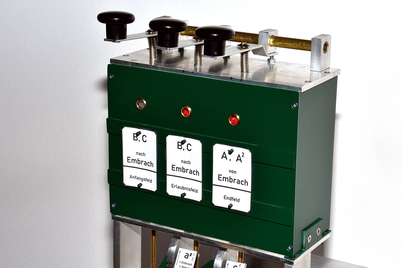 - Fahrstraßenhebel mit Verschlussregister zum stellen von je zwei Einfahr- und Ausfahrstraßen mit Signalabhängigkeit